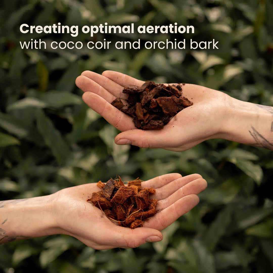 Como los Anthuriums son epífitos y generalmente tienen raíces más grandes, hay muchos chips de coco y corteza para permitir espacio para eso. Los Anthuriums son propensos a la pudrición, por lo que con el carbón activado y la perlita añadidos, se produce una combinación de aireación y purificación en el suelo en todo momento. Esto combate en gran medida el riesgo de pudrición de las raíces. ¡La mezcla perfecta para Anthurium!
